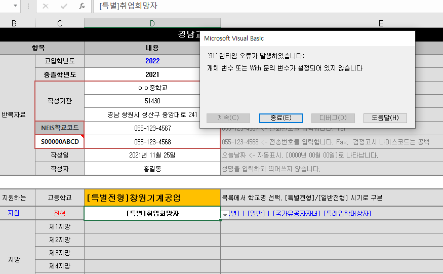 런타임 오류가 발생하여 지망학과가 활성화 안될경우에는 특별전형 창원기계공업고등학교를 한번 더 클릴 해 주시면 됩니다.