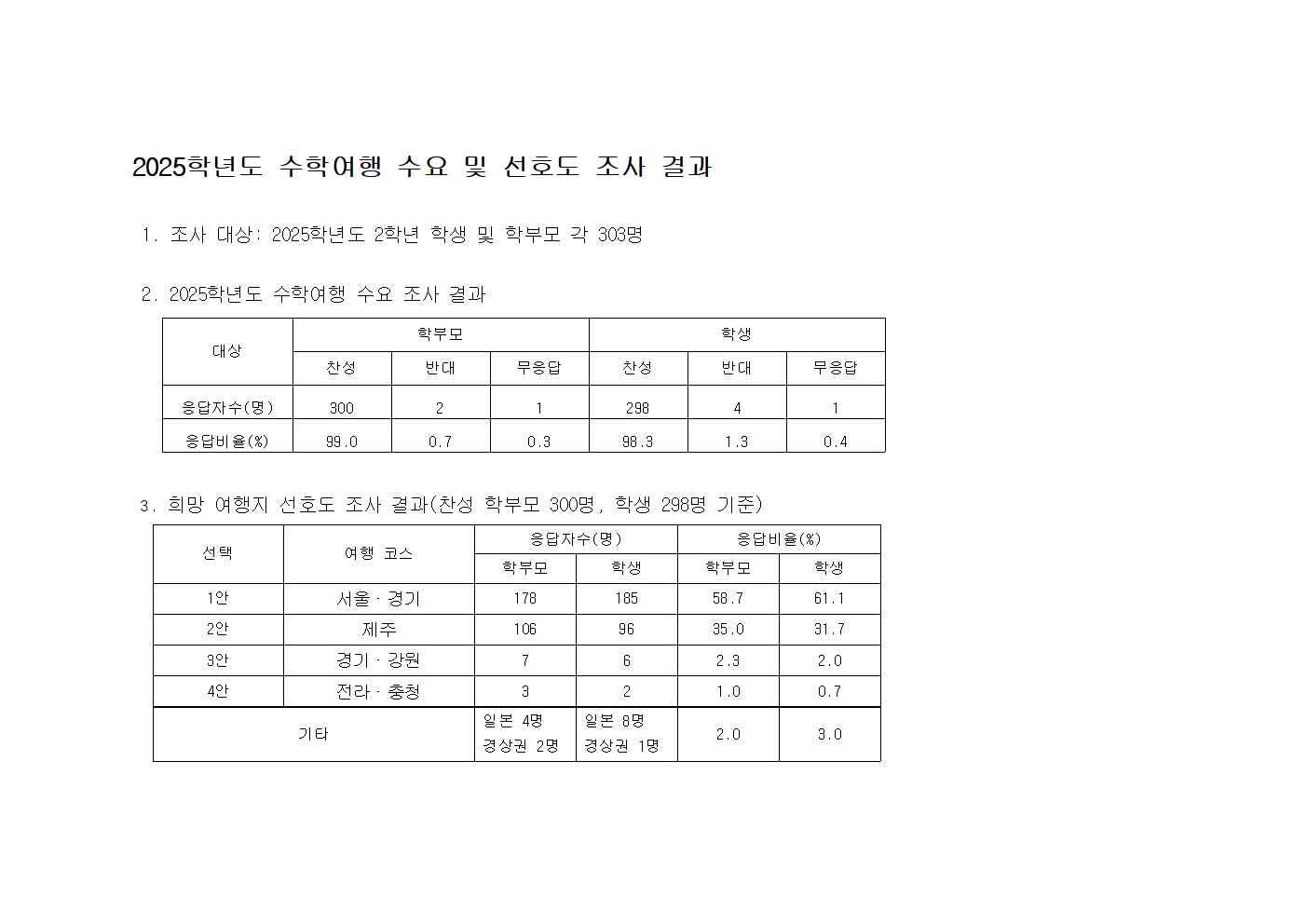 2025년 수학여행 수요조사 및 선호도 조사 결과 알림